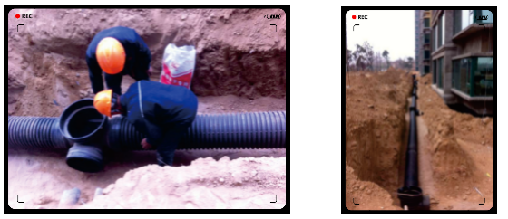 高密度聚乙烯是高分子聚合物,其雙壁波紋管剛?cè)峒鎮(zhèn),具有較高的環(huán)剛度和良好的柔韌性,故在應(yīng)用中,無需混凝土管基、溝槽驗收合格后即可直接覆管,實現(xiàn)邊開挖、邊下管、邊回填,簡化了施工程序,極大地縮短了工期。其良好的環(huán)剛度可保證管道敷設(shè)路面的重載通行安全,可使管道克服地震、地面不均勻沉降造成的破壞應(yīng)力,提高了公用設(shè)施的抗震能力和長期運行可靠性。