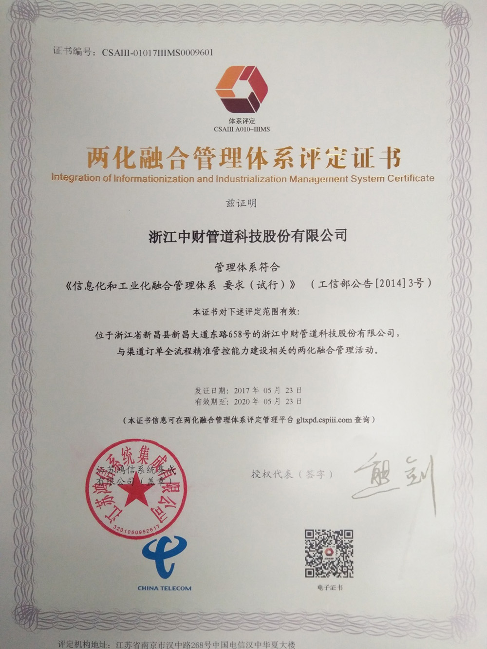 浙江中財(cái)管道通過(guò)國(guó)家兩化融合管理體系認(rèn)定并獲政府獎(jiǎng)金100萬(wàn)